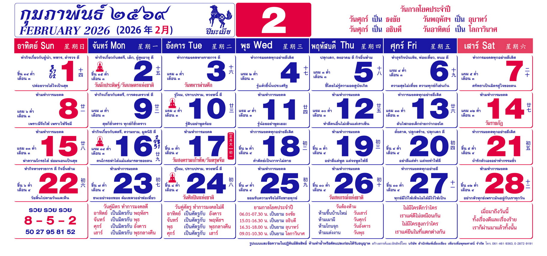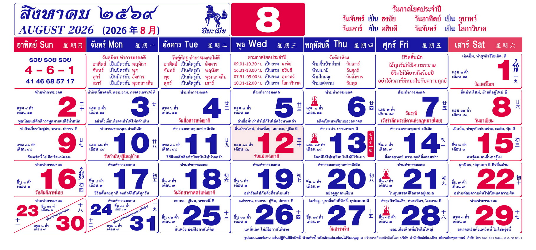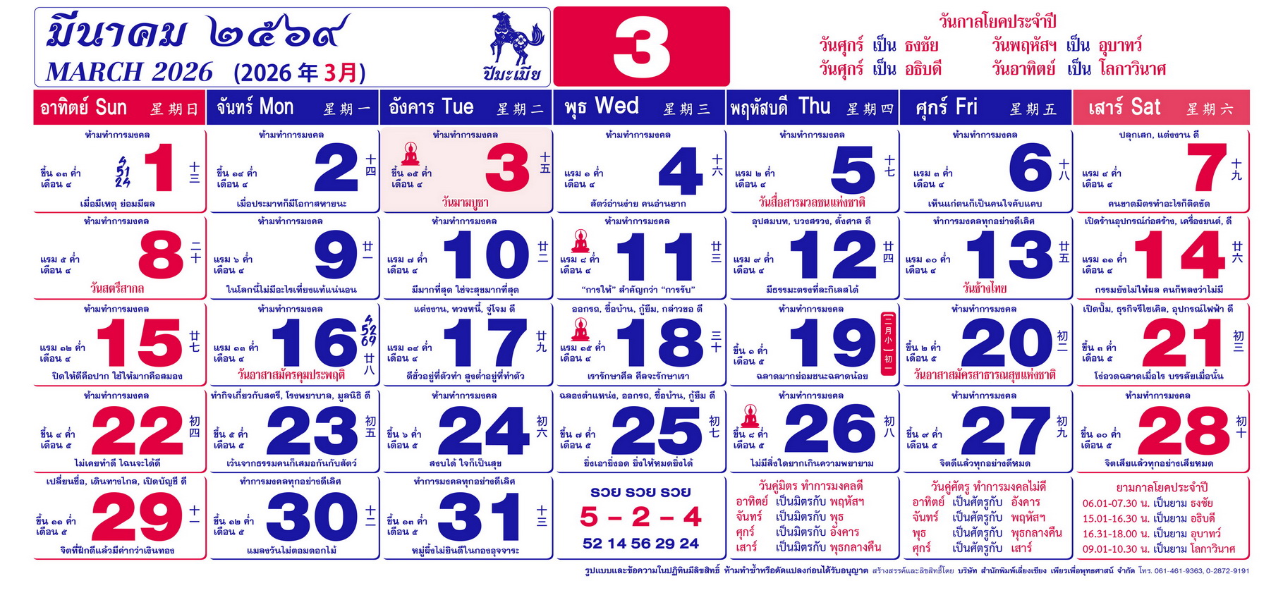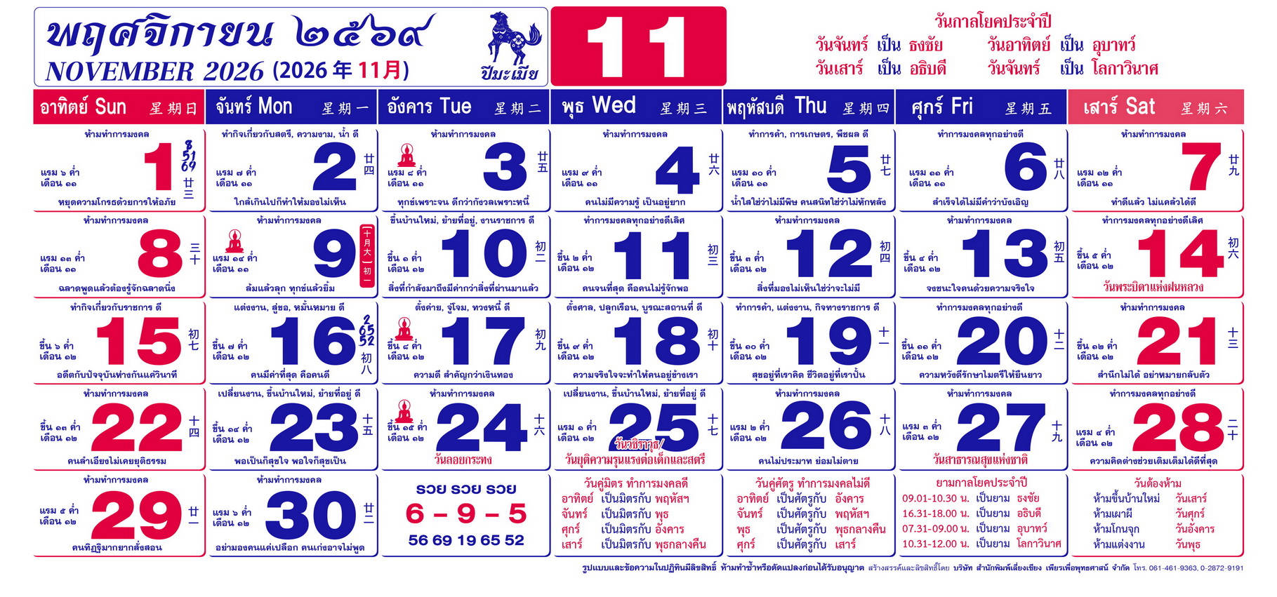 เนื้อหาปฏิทิน ฤกษ์งามยามดี 2569