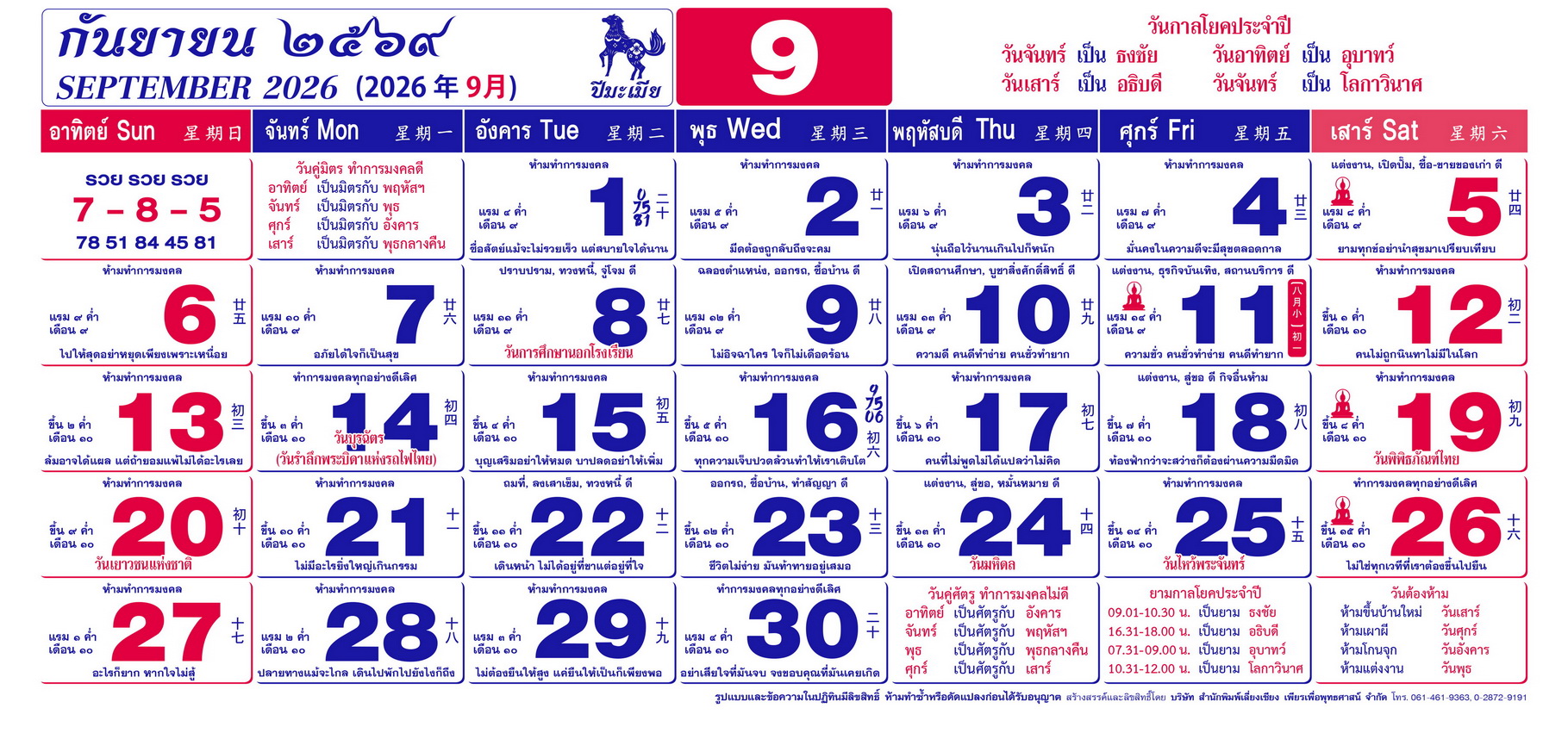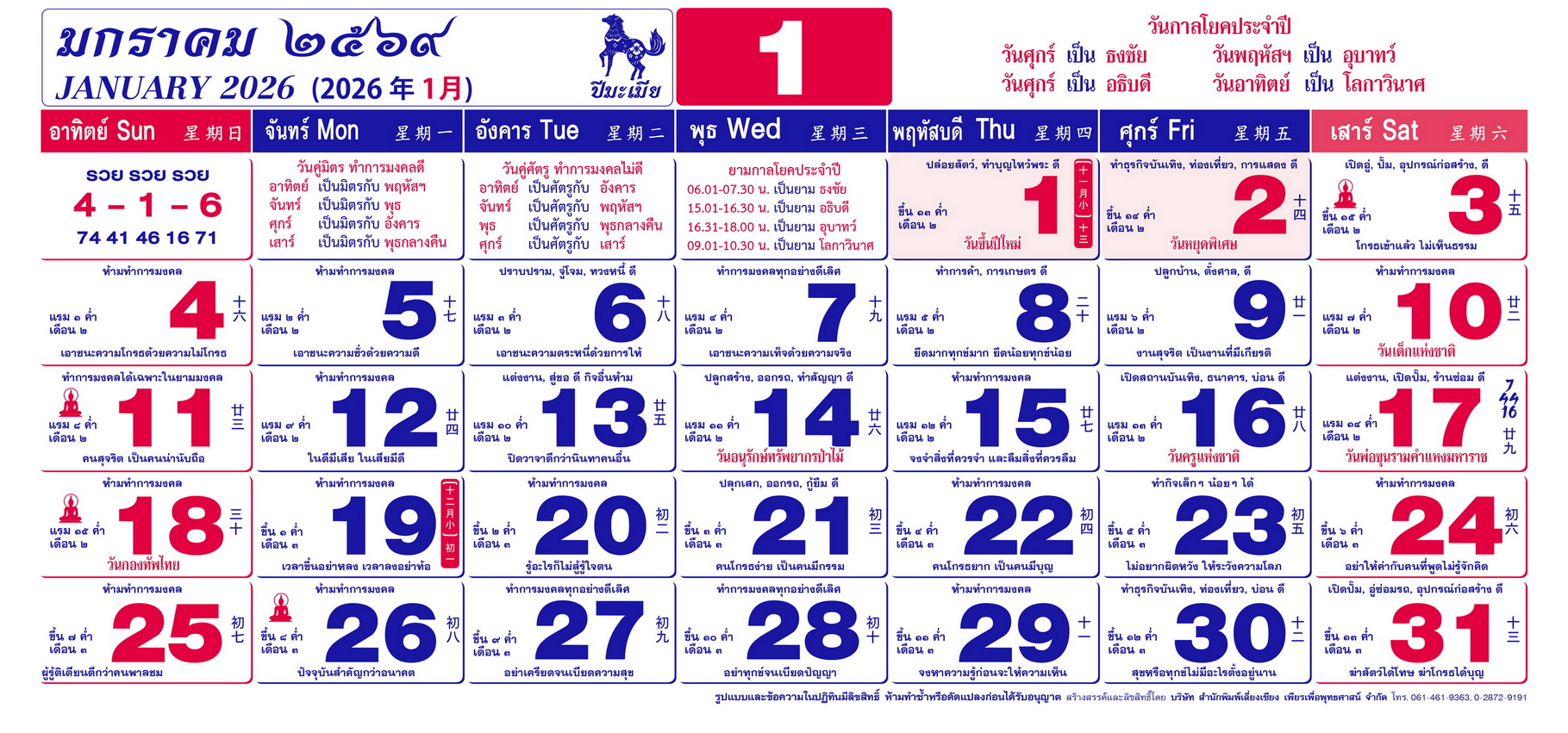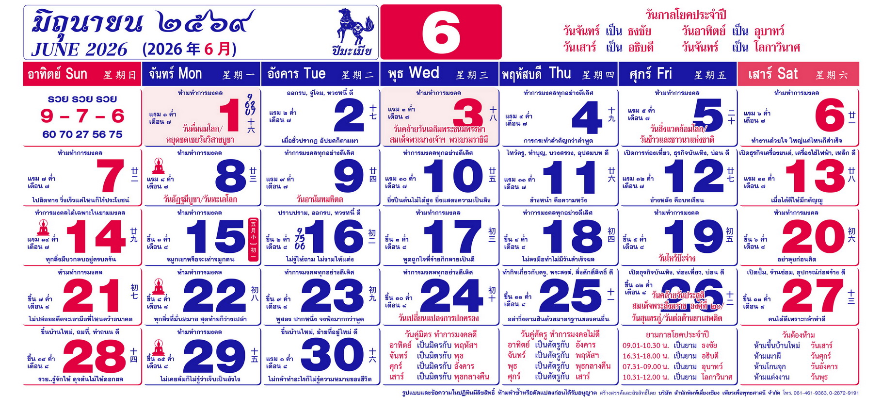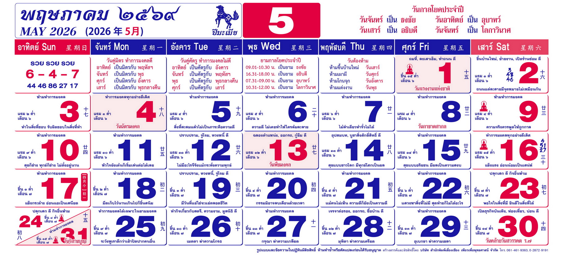 เนื้อหาปฏิทิน ฤกษ์งามยามดี 2569